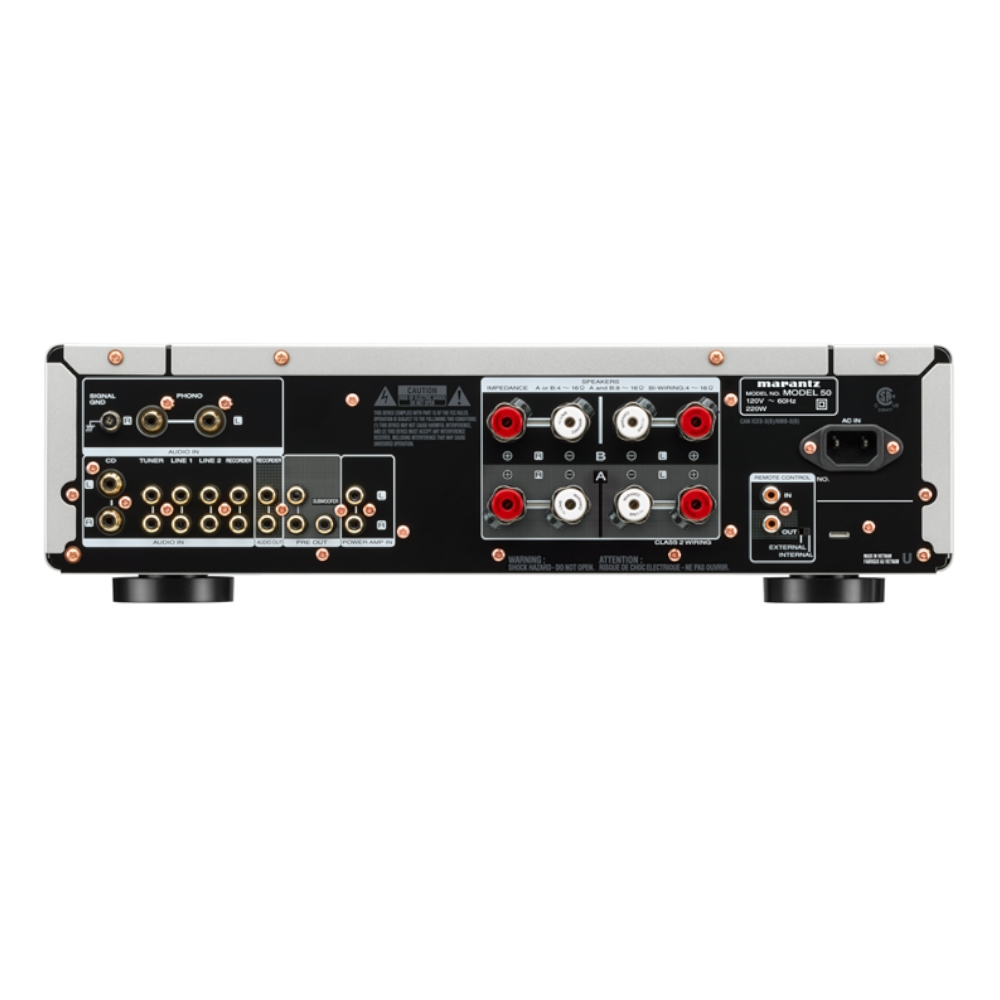 Благодаря шести аналоговым входам MODEL 50 может принимать звук от множества компонентов источников звука, а также включает в себя усовершенствованный встроенный фонокорректор.