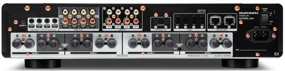 Новинка, которую при необходимости можно монтировать в стандартную аппаратную стойку, полностью повторяет функционал Model M1, при этом, предоставляет восемь каналов усиления по 100 Ватт (при работе на нагрузку номинальным сопротивлением 8 Ом) для создания распределённой аудиосистемы мультирум в вашем доме. То есть, Marantz Model M4 позволяет оснастить четыре комнаты полноценным стерео c четырьмя независимыми модулями HEOS.