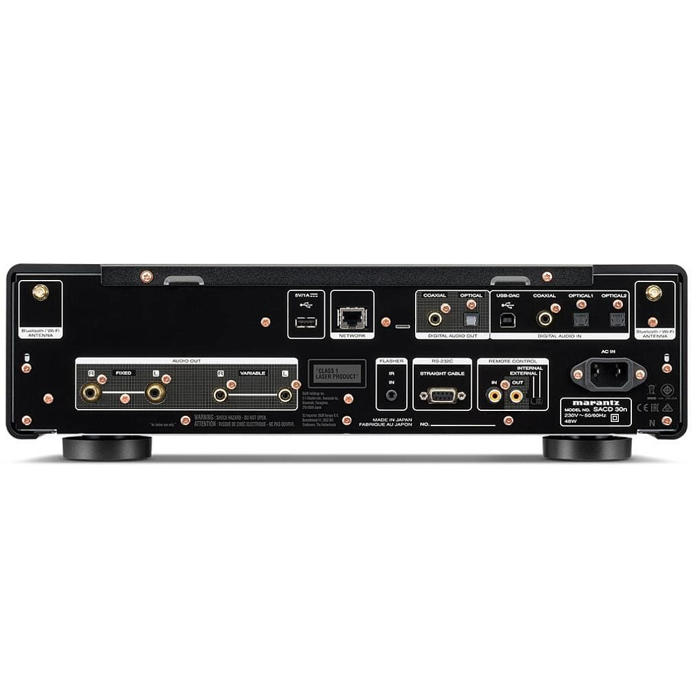 Фронтальная и боковые панели корпуса выполнены из алюминия, а жесткая верхняя крышка — из стали. На тыльной стороне проигрывателя находятся два линейных выхода RCA (регулируемый и фиксированный). Имеется набор входов и выходов S/PDIF, USB-порт для внешних накопителей, LAN-интерфейс для подключения к локальной сети и асинхронный USB для соединения с компьютером, поддерживающий PCM до 32 бит/384 кГц и DSD (до 11,2 МГц). Также присутствуют разъемы системной шины, интерфейс RS-232C и ИК-порт. Для управления Marantz SACD 30n используется комплектный пульт ДУ.