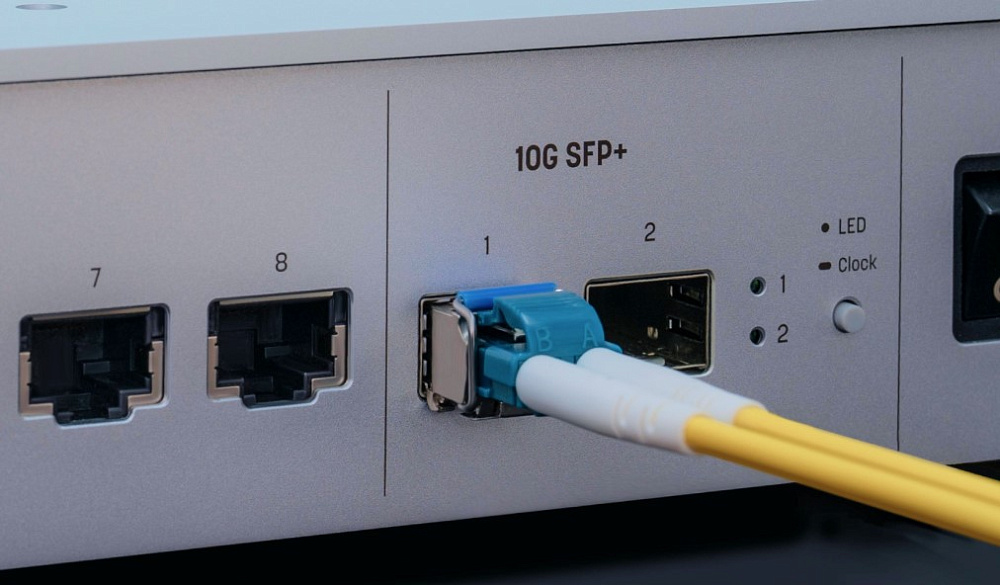 Кабель для внешнего интернет-соединения рекомендуется подключать к оптоволоконному порту SPF или к одному из высокоскоростных портов RJ45 (с 3 по 8).