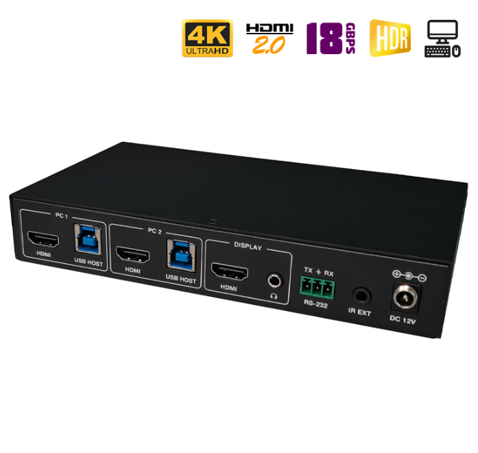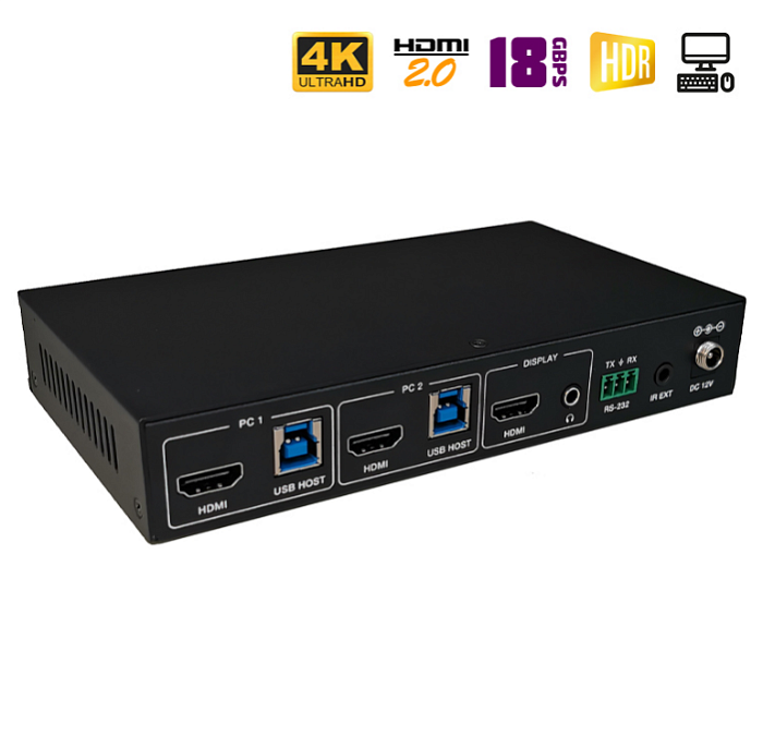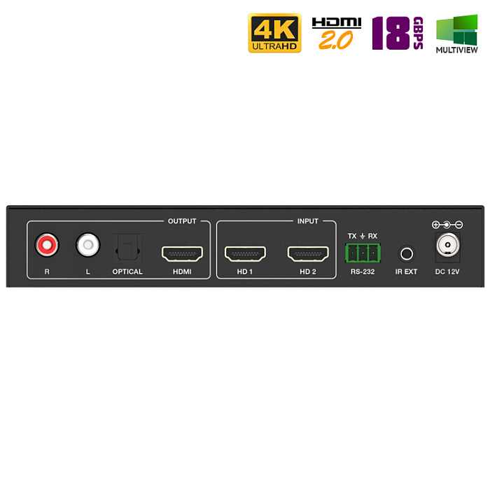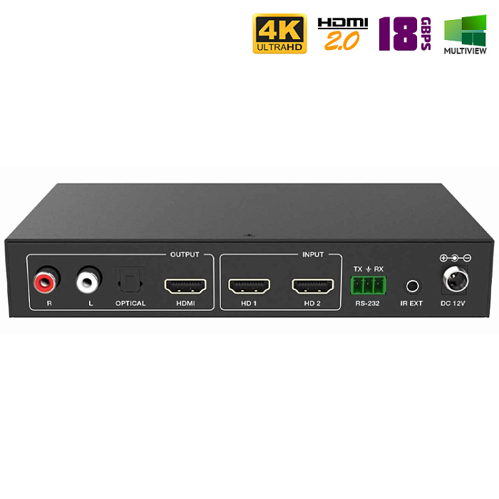 HDMI переключатель с мгновенным переключением из модельного ряда 2024 года. Передаст аудио- видео- сигнал ультравысокой четкости (4K) от двух источников на один экран (телевизор, монитор, проектор и т.п.). Поддержка стандарта HDMI 2.0b: 4K при частоте 60 Гц, YUV 4:4:4, 3D, 18Gbps, HDCP 2.2 и прочее. Есть управление по RS232, аудио выходы для извлечения звука Toslink и Left/Right RCA, а также функция "Мультикартинка". Переключение между источниками без задержек (бесшовное).