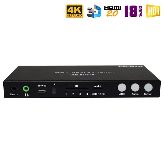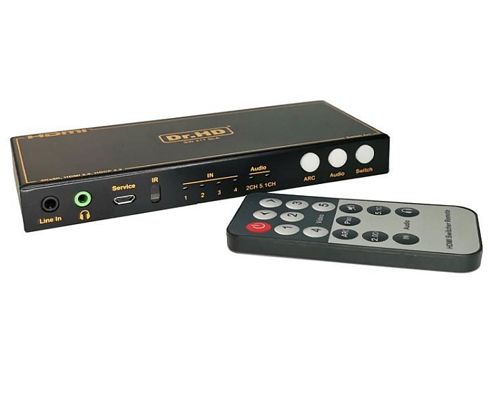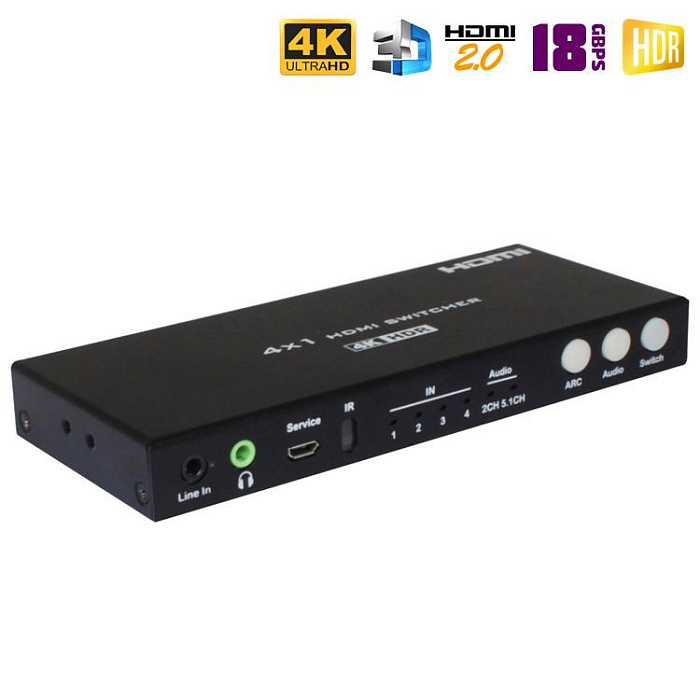 Новинка 2025 года. HDMI переключатель 4 на 1 с поддержкой 8K. Поддерживаются все спецификации стандарта HDMI 2.1: разрешение 8K с частотой 60Hz и 4K с частотой 120Hz, протокол защиты HDCP 2.3, динамические диапазоны HDR, HDR10, HDR10+, Dolby Vision, и HLG, пропускную полосу 48Gbps и 3D 8K. Для вывода звука на аудио устройства имеет цифровой аудио интерфейс Toslink (SPDIF) и аналоговый 3.5mm Audio mini-jack.