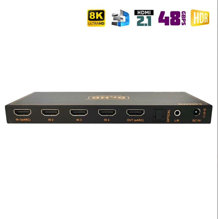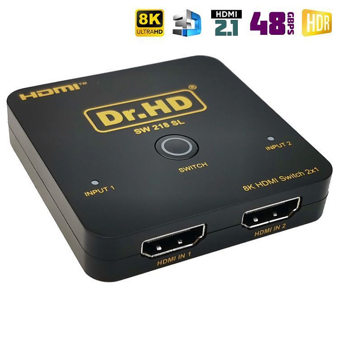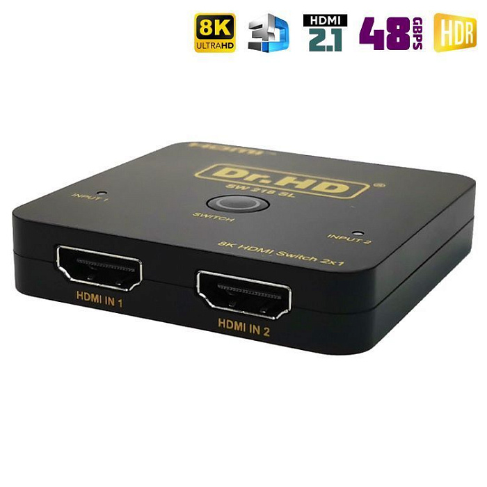 Новинка 2023 года! Самый продвинутый 8K свитч 2 на 1 из ассортимента компании Dr.HD. Модель поддерживает все спецификации стандарта HDMI 2.1: разрешение 8K, протокол защиты HDCP 2.3, динамические диапазоны HDR, HDR10, HDR10+, Dolby Vision, и HLG, пропускную полосу 48Gbps и 3D 8K