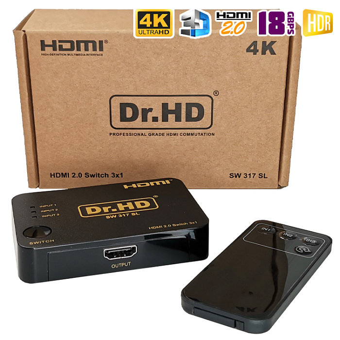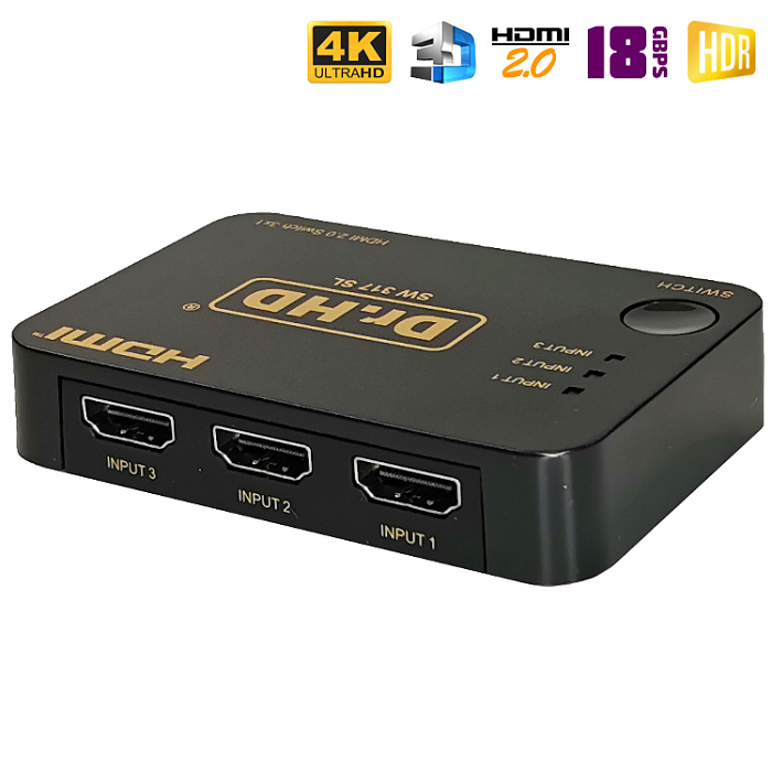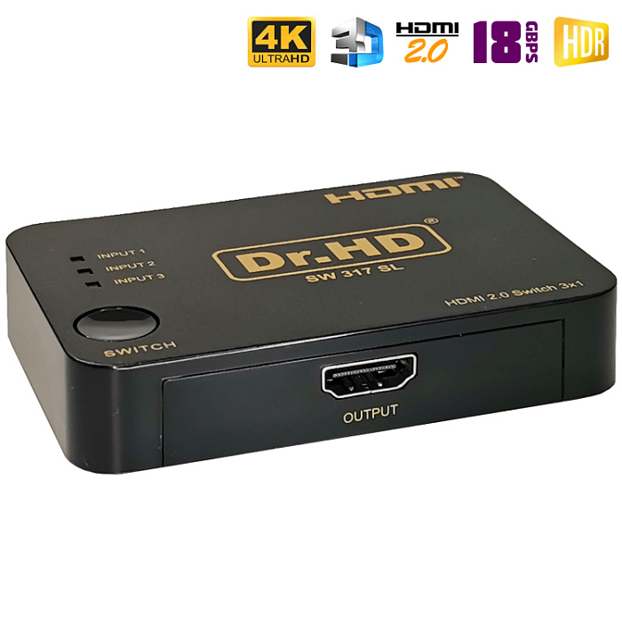 HDMI свитч с поддержкой спецификаций HDMI 2.0. Объединит 3 HD-устройства и передаст сигнал на одно устройство воспроизведения. Компактные размеры, поддержка разрешений 4К c частот 60Hz, HDCP 2.2, HDR, 18Gbps и пр. Данная модель является улучшенной версией переключателя Dr.HD SW 314 SL.