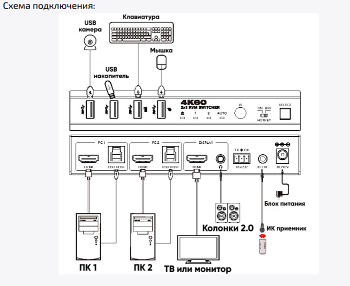 Новинка осени 2025 года! KVM и переключатель интерфейсов HDMI и USB с поддержкой 4K. Управляйте удаленно компьютером, видео регистратором, периферийными устройствами и прочими девайсами, с помощью клавиатуры и мыши, выводя изображение на экран монитора или телевизора.