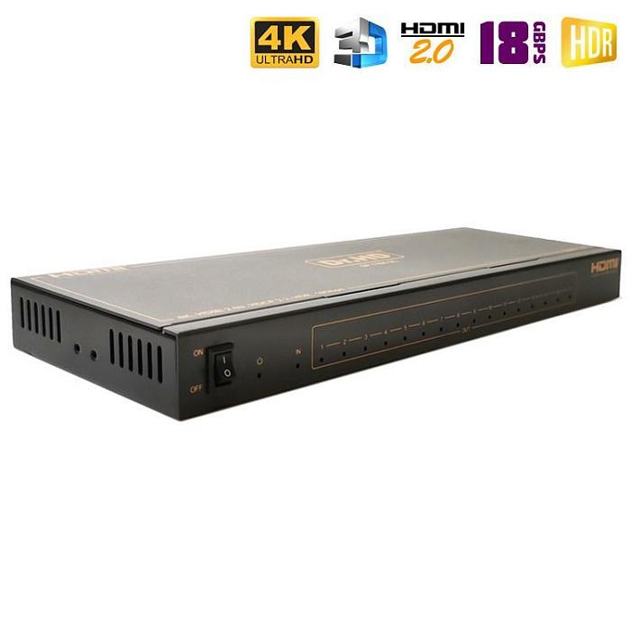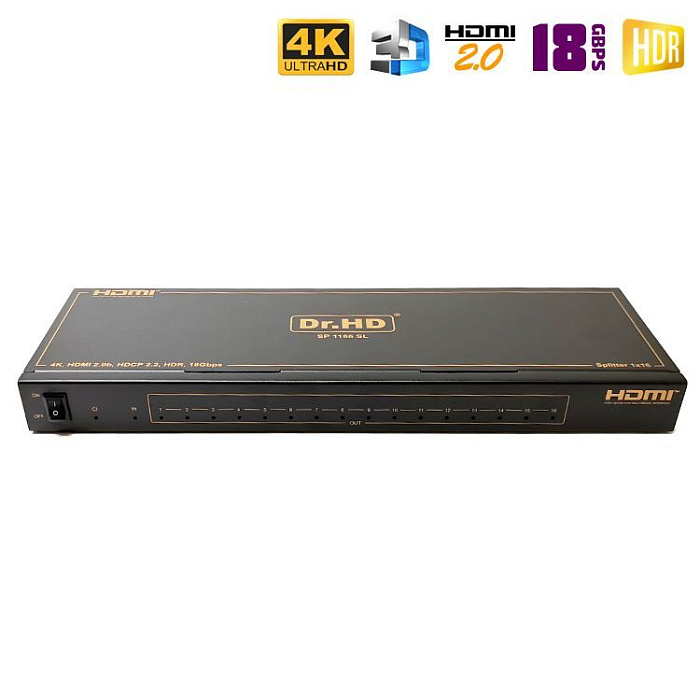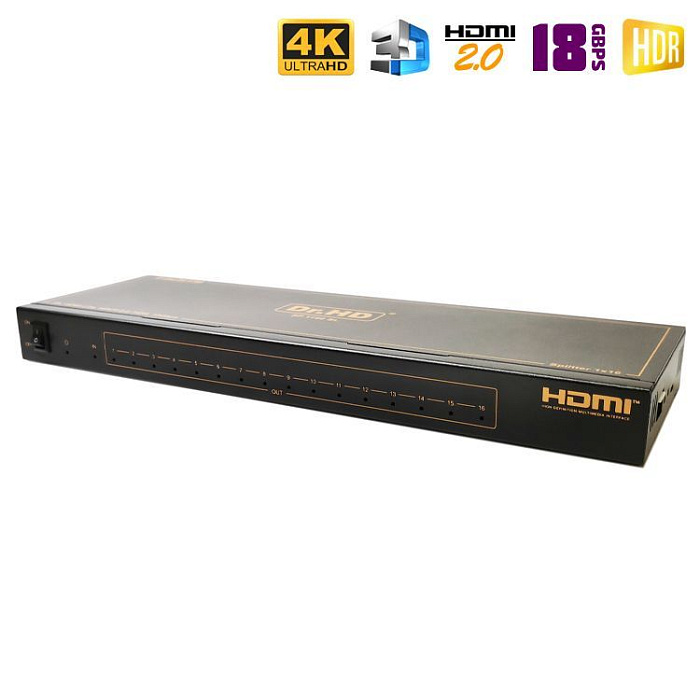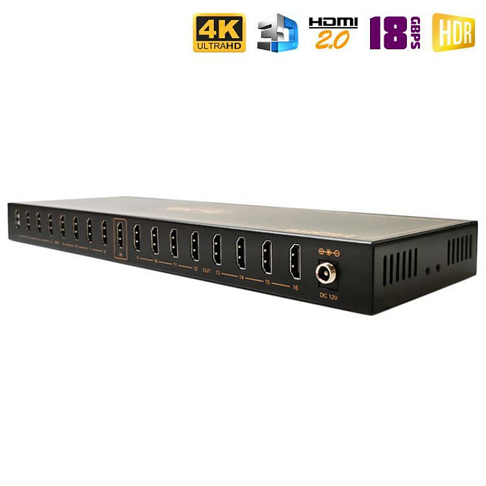 HDMI делитель из модельного ряда 2022 года. Служит для вывода видео- аудио- контента качества 4Kx2K и Full HD с одного источника сразу на 16 экранов! Поддержка HDMI 2.0, Ultra HD 4K с частотой до 60Hz, 3D, 18Gbps, HDR, протокола HDCP 2.2, и аудио форматов LPCM 7.1CH, Dolby TrueHD, DTS-HD Master Audio. Имеется ручной переключатель EDID для тонкой настройки.