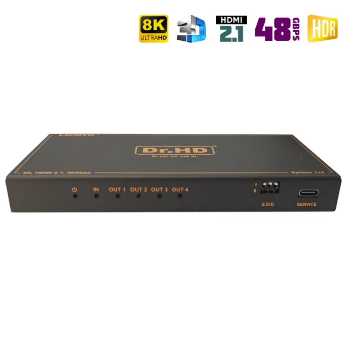 Новинка 2025 года! Разветвитель HDMI на 4 с поддержкой 8K 60Hz и 4K 120Hz, протокола защиты HDCP 2.3 и ниже, динамических диапазонов HDR, HDR10, HDR10+, Dolby Vision и HLG, пропускной способностью 48 Гбит/с и прочими опция из спецификации HDMI 2.1. Благодаря EDID переключателю пользователь может самостоятельно выбрать режим работы устройства.