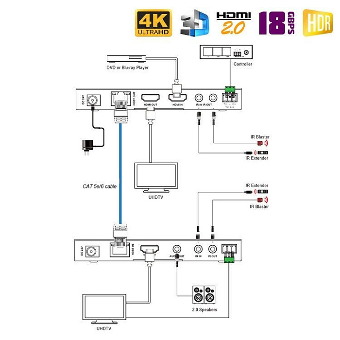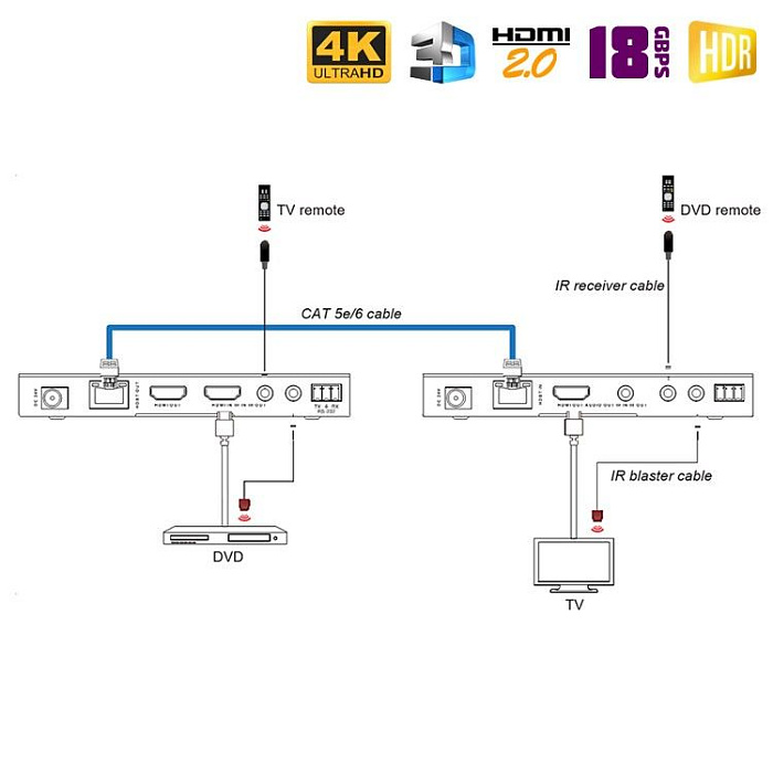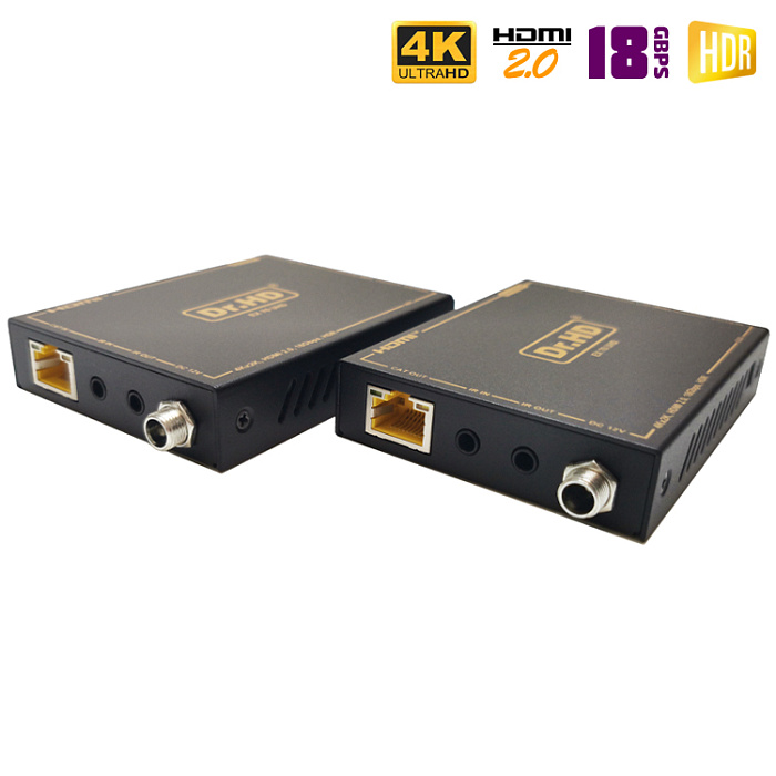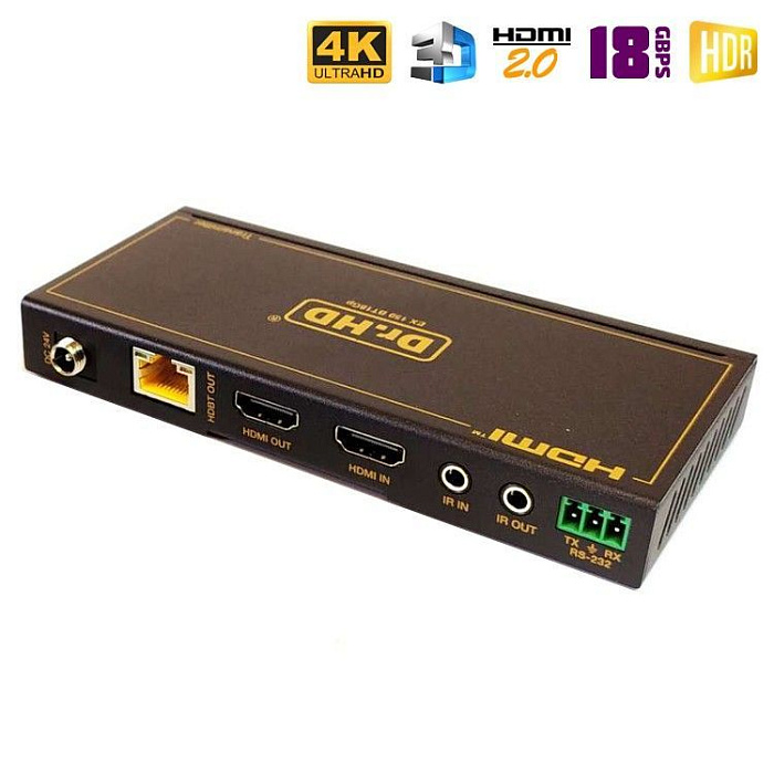 Новинка 2020 года. HDMI удлинитель по витой паре со всеми "наворотами"! Поддержка HDMI 2.0b, протокола защиты HDCP 2.2, 4Kx2K при частоте 50/60Hz, 3D, HDBaseT, а значит никакой задержки, цветовая субдискретизация 4:4:4, скорость передачи данных 18Gbps, HDR и HBR, передача команд по RS232, двунаправленное ИК-управление и др. Расстояние передачи – до 150 метров.