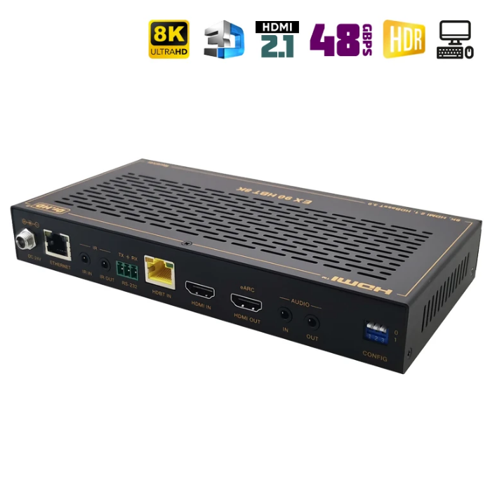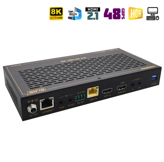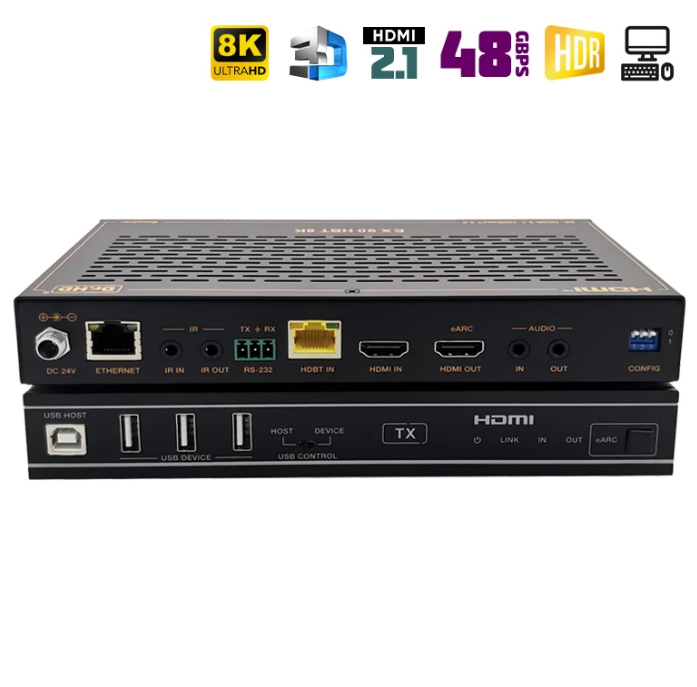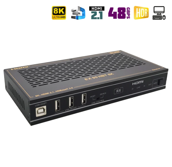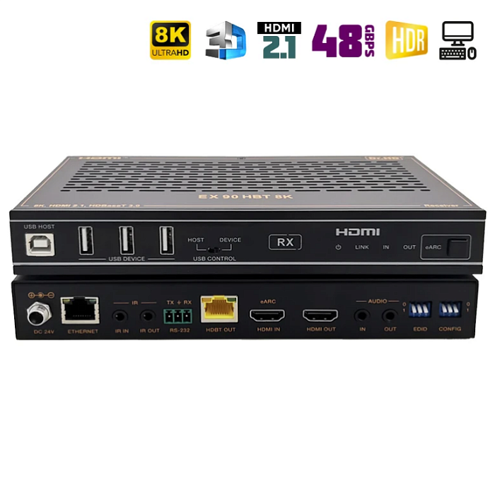 Новинка 2025 года! Многофункциональное устройство, которое совмещает в себе аудио- и видео- удлинитель и устройство для удаленного управления ПК, так называемое KVM. HDMI удлинитель Dr.HD EX 90 HBT 8K обладает максимальными, на данный момент, характеристиками: HDMI 2.1, HDCP 2.3, 8K 30Hz, 4K 120Hz, 40Gbps, HDR, HDR10, HDR10+, Dolby Vision, HLG и пр. Передачи сигнала осуществляется на расстояние до 90 метров по витой паре, а благодаря поддержки технологии HDBaseT 3.0, сжатие и потери качества будут минимальными. Присутствует обратный аудиоканал eARC/ARC, двунаправленное ИК управление, а также сквозная передача управления по RS-232. Питается комплект (приемник - передатчик) только от одного блока питания. Все это делает этот удлинитель по-настоящему уникальным на отечественном рынке.