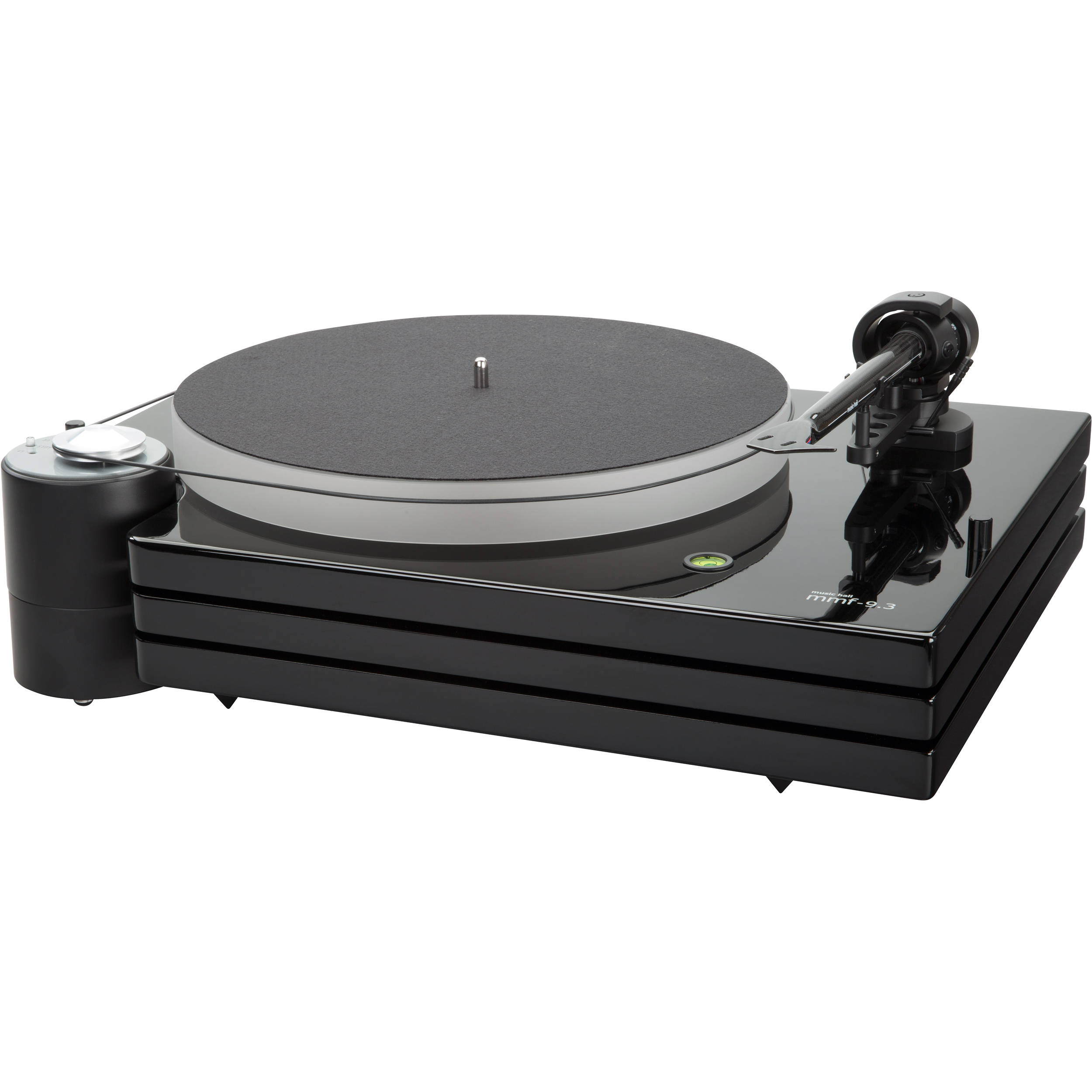 Проигрыватель виниловых дисков Music Hall MMF-9.3 (без картриджа) имеет стол, состоящий из трех платформ, изолированных друг от друга шестью сорботановыми амортизаторами, установлен на трех шиповидных регулируемых опорах. Внешний двухскоростной двигатель 15 В. постоянного тока, с кварцевой стабилизацией скорости вращения. Не резонансный акриловый опорный диск, закрытый керамический опорный подшипник. Тонарм с регулируемой прижимной силой, задемпфированный микролифт, антискейтинг, проводники из сверхчистой меди, позолоченные RCA-разъемы.