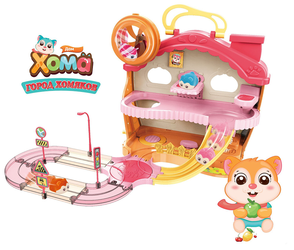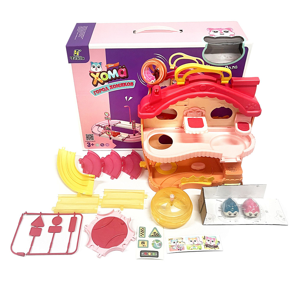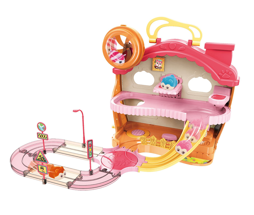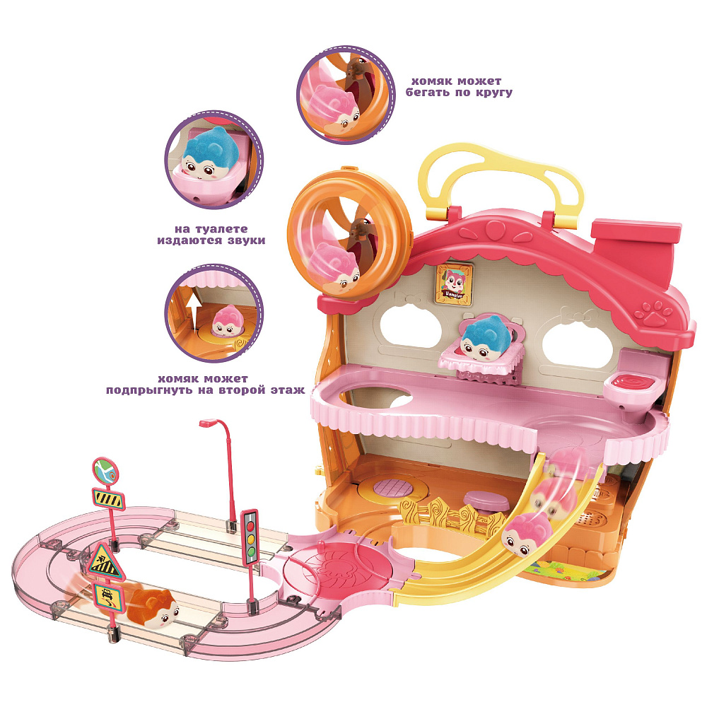 Набор игровой Fenfa "Город хомяков" Розовый Дом Лолы (2 хомяка, свет, звук) - 1619B - это игровой набор, в который входят элементы для постройки двухэтажного домика, в котором будут жить интерактивные хомячки. Кроме этого в набор уже входит один интерактивный хомячок уникальной расцветки и аксессуары для игры с ним. Хомячку будет очень комфортно жить в таком коттедже. На втором этаже домика оборудована спальня, в которой есть кровать, ванная комната с туалетом и беговое колесо для занятий спортом. Подняться с первого этажа на второй хомячок сможет на лифте. На первый этаж домика хомячок будет спускаться по наклонному треку, сразу попадая в столовую, где он с удовольствием покушает. Также хомяк может устроить увлекательную прогулку на улице.