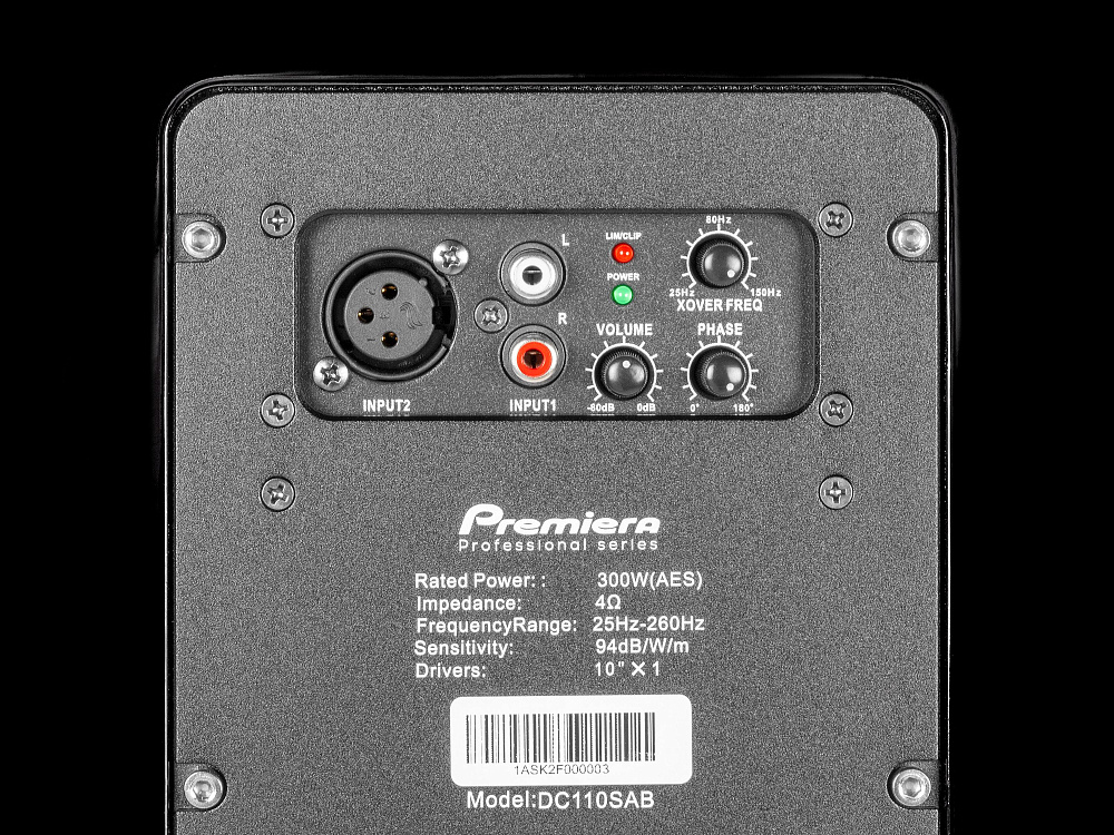 Мощность: 300 Вт. Диапазон частот: 25-260 Гц. Чувствительность: 94 дБ. Макс звуковое давление 121 дБ. Драйвер НЧ: 1 x 10 дюймов. Регулировка частоты среза, фазы и уровня сигнала. Цвет черный лак.