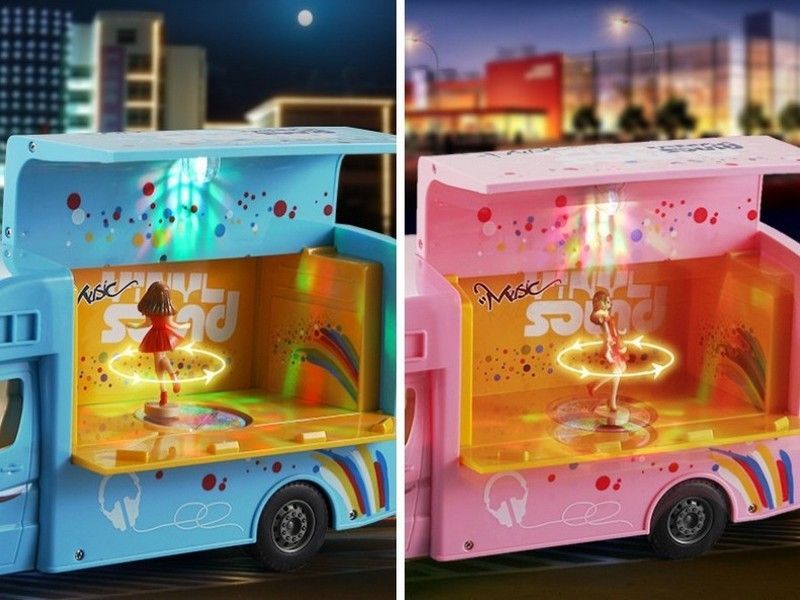 Фургон Сцена на колесах открывается дистанционно и превращается в музыкальную сцену, с танцующей куколкой под три разные мелодии. И это еще не все, машинка Сцена на колесах имеет функцию Bluetooth колонки, с которой можно подключить фургон к любому устройству с поддержкой Bluetooth и наслаждаться любимыми музыкальными композициями. Под потолком сцены в фургоне Double Eagle установлен светящийся "диско-шар", который так же активируется кнопкой на пульте.