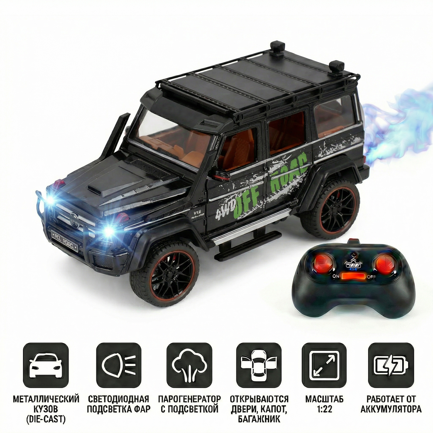 Радиоуправляемая металлическая машина Mercedes G500 1:22 - HCL-3801-BLACK - это стильная и детализированная модель с кузовом DIE-CAST, светодиодной подсветкой фар и эффектным парогенератором с подсветкой. Открывающиеся двери, капот и багажник делают модель максимально реалистичной. Отличный вариант для игры и подарка.