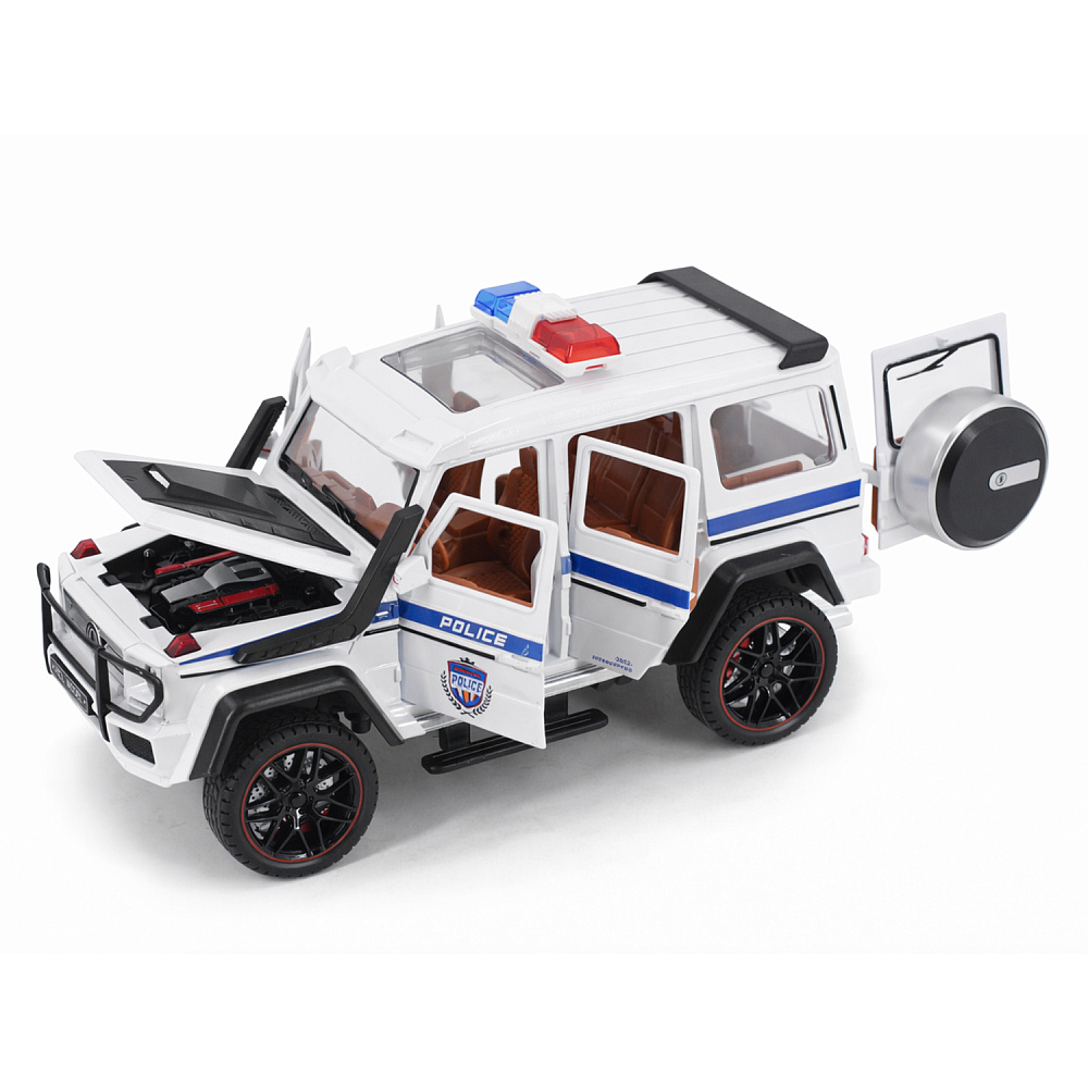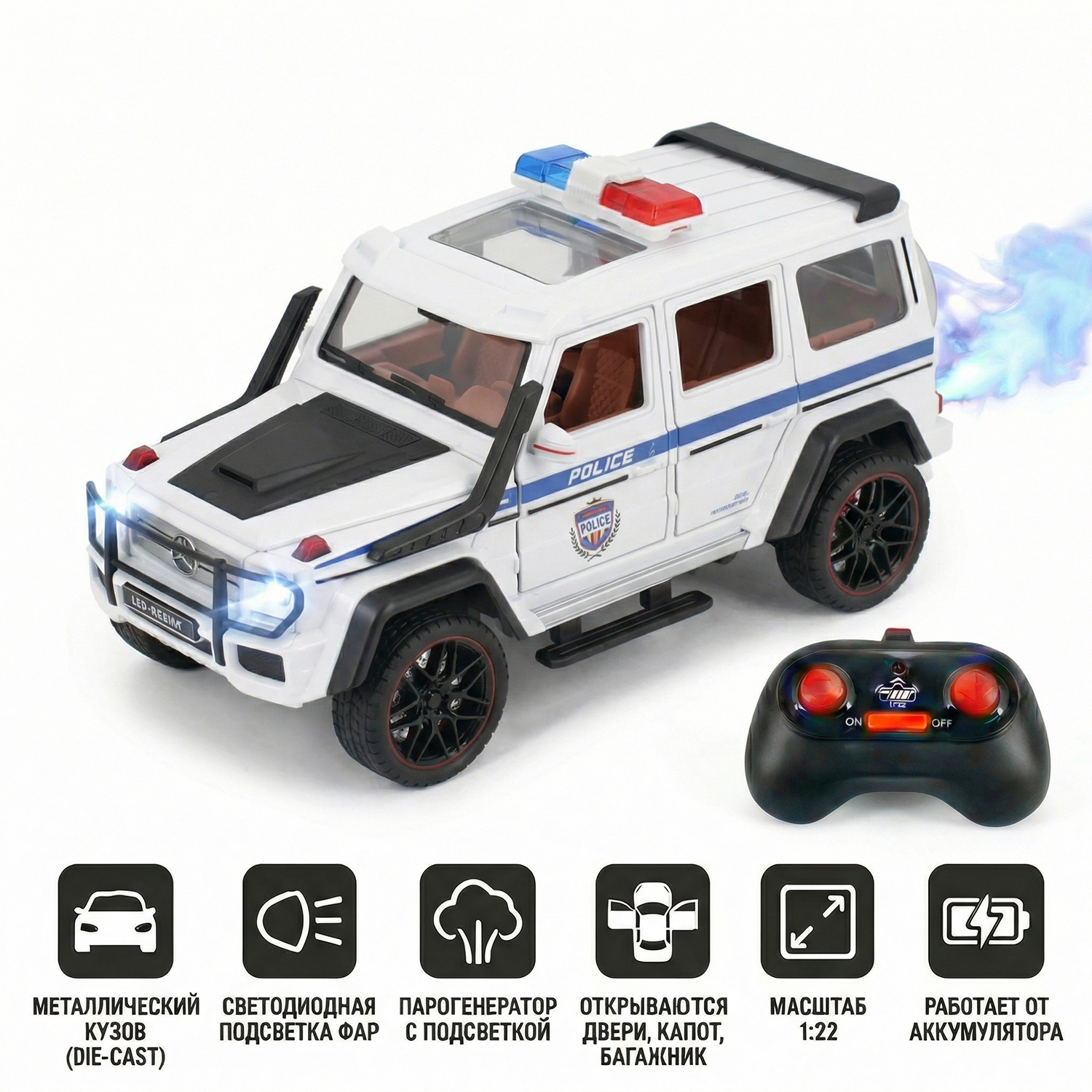 Радиоуправляемая металлическая полицейская машина Mercedes G500 1:22 - HCL-3608-WHITE - это стильная и детализированная модель с кузовом DIE-CAST, светодиодной подсветкой фар и эффектным парогенератором с подсветкой. Открывающиеся двери, капот и багажник делают модель максимально реалистичной. Отличный вариант для игры и подарка.