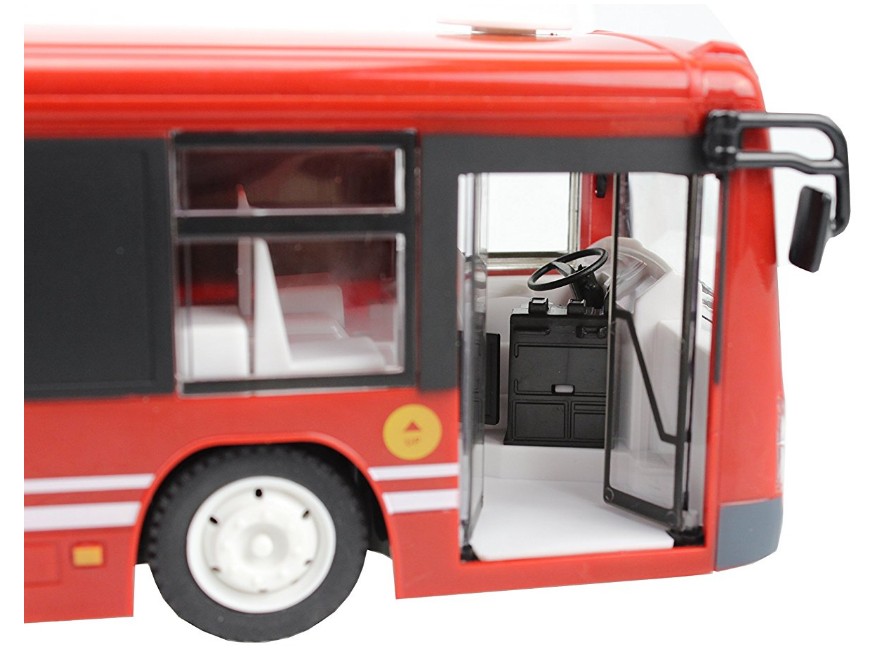 Антенна встроена в корпус. 4-х канальная радиоаппаратура работает на частоте 2,4Ггц и обеспечивает бесперебойную маневренность автомобиля влево, вправо, назад и вперед в радиусе 100 м. Звуковое сопровождение с регулируемой громкостью имитирует характерные звуки при остановке автобуса, открывании/закрывании дверей, сигнале. Так же предусмотрена подсветка фар и салона автобуса.