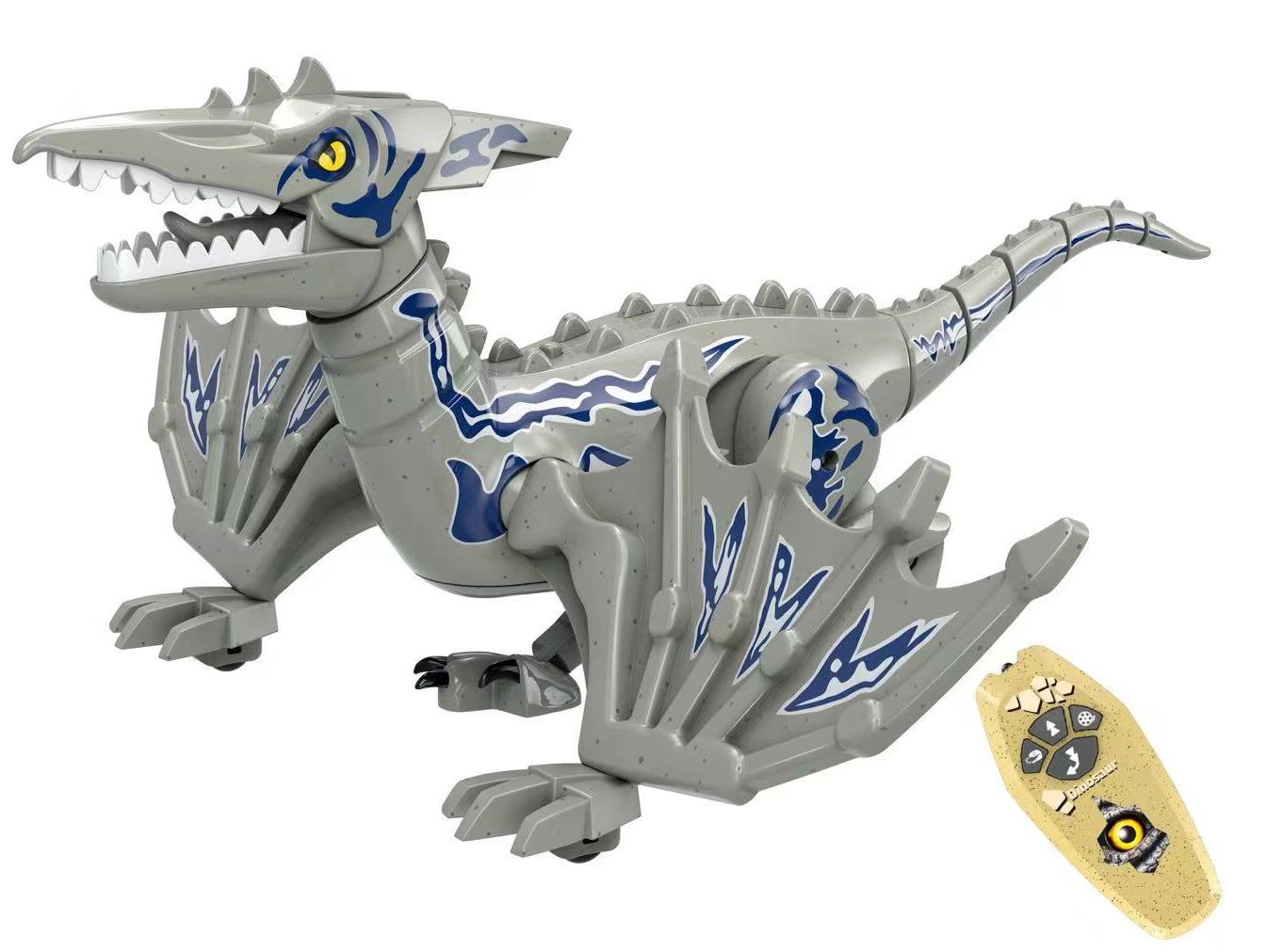 Такого питомца на радиоуправлении можно приютить у себя. Он может двигаться вперед и назад, поворачивать вправо, влево и при движении реалистично изгибается тело и шевелится хвост. Благодаря колесикам, установленным на передних конечностях, динозавр имеет дополнительные точки опоры и поэтому очень устойчив. Подсветка пасти в темноте выглядит зловеще и придает динозавру реалистичности. Кроме того, динозавр издает реалистичные звуки.
