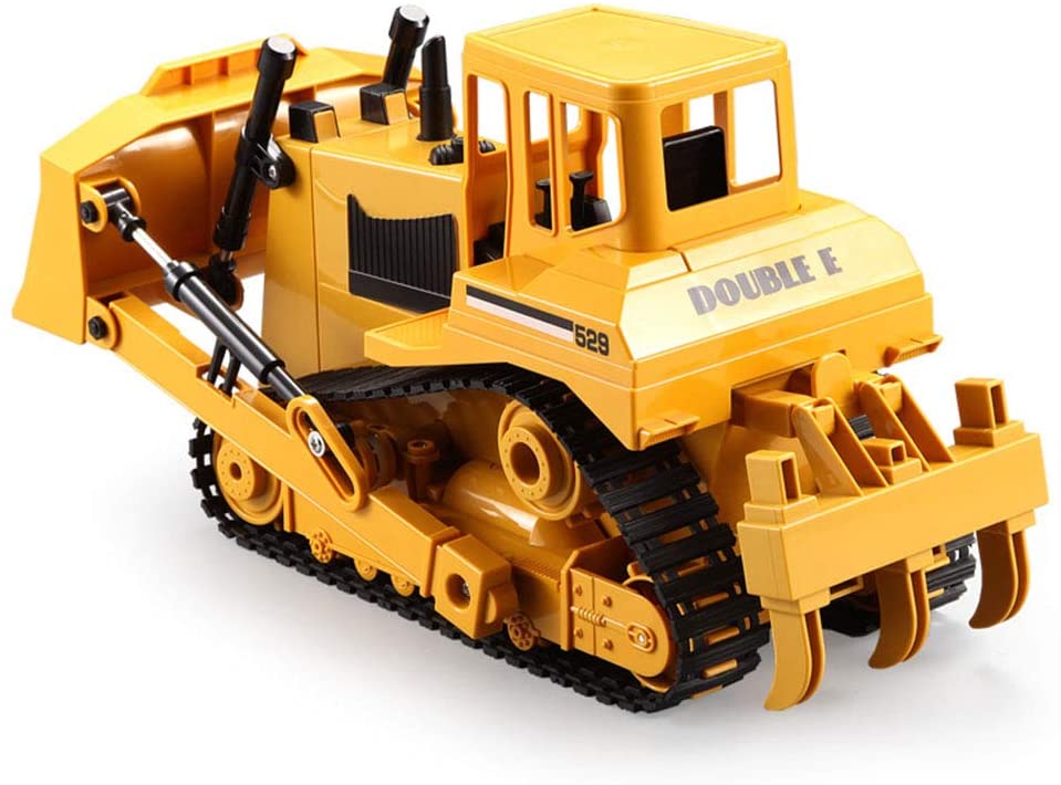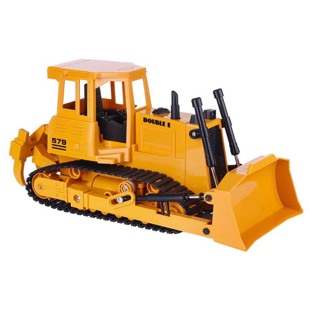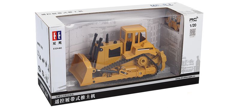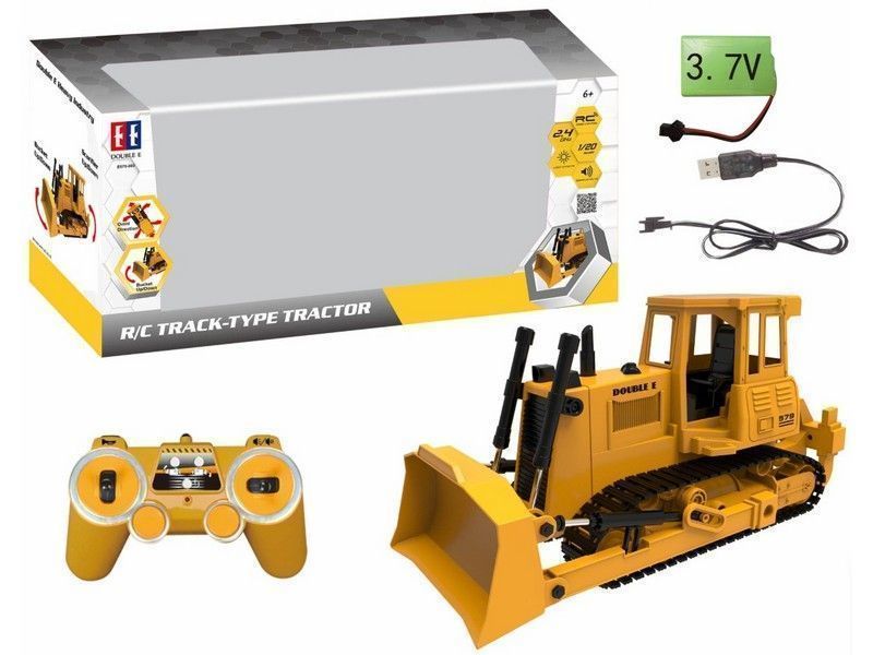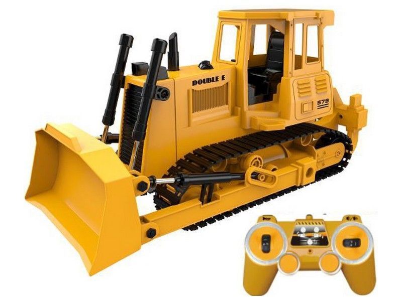 Радиоуправляемый гусеничный бульдозер Double E 1:20 2.4G - E579-003:имеет строительный желтый стиль. Он полностью выполнен из прочного пластика, четыре электромотора обеспечивают движение вперед и назад, повороты влево и вправо, а так же для движения ковшом и вилами разрыхлителя.