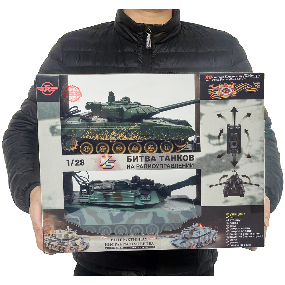 Радиоуправляемый танковый бой (советский T72 + M1 Абрамс США) - RWG99851 - это набор из двух радиоуправляемых моделей танков, которые работают на частоте 2.4G. Стрельба осуществляется инфракрасным лучом на расстояние до 3 м в секторе до 10 градусов. Имитируется выстрел пушки. На задней части башни 5 светодиодов жизнеспособности танка. Танк издает звук работы двигателя и звук выстрела орудия. Питание танка происходит от аккумулятора 4.8v 700mAh, а зарядное устройство входит в комплект поставки.